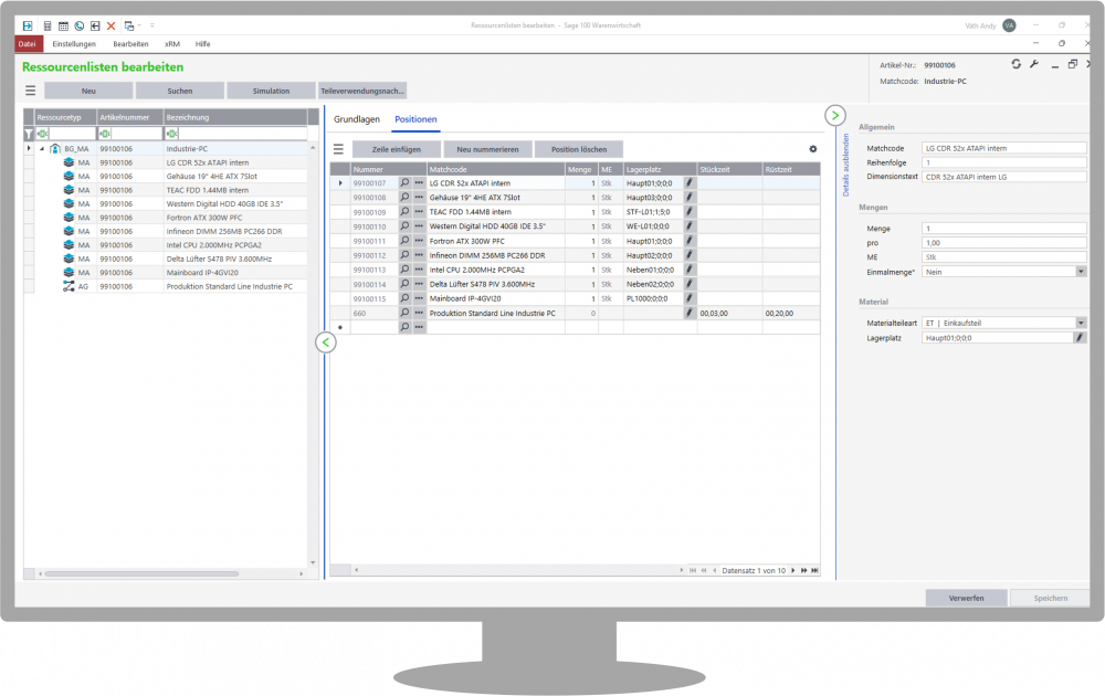 Übersichtliche, grafische Darstellung der Ressourcenliste (Materialien, Arbeitsgänge etc.) als Baumstruktur.